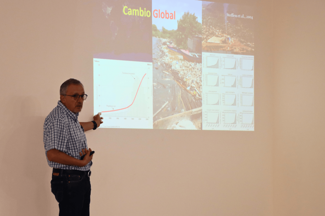 Durante su exposición, el especialista explicó que el cambio global va más allá del cambio climático, ya que contempla todas las transformaciones provocadas por la actividad humana en el planeta, desde el crecimiento urbano y la contaminación, hasta las alteraciones en ecosistemas terrestres y marinos.