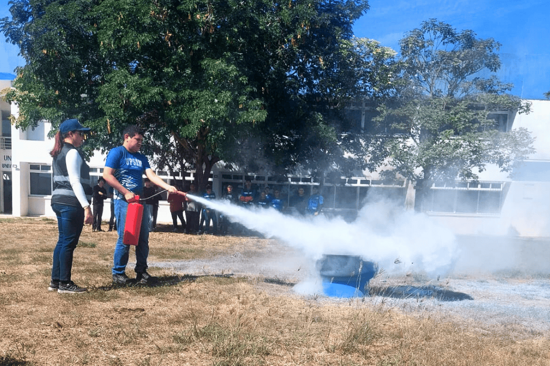 Como parte de su formación académica integral, estudiantes de la carrera de Ingeniería en Energía y Desarrollo Sostenible participaron durante el mes de febrero en el Curso de Prevención y Combate de Incendios, desarrollado en el área del punto de reunión ubicada entre el Edificio 3 y el Edificio 4.