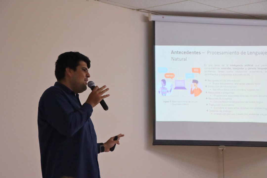 Durante la exposición, el tesista explicó que el objetivo general del proyecto consiste en apoyar la identificación de medicamentos en personas adultas mayores con baja visión, mediante el desarrollo de una aplicación móvil que integra visión artificial y un asistente de voz, facilitando así una ingesta más segura y autónoma.