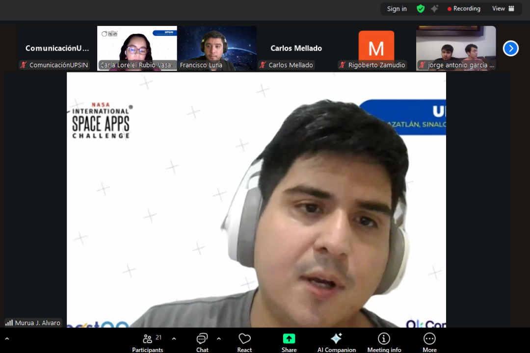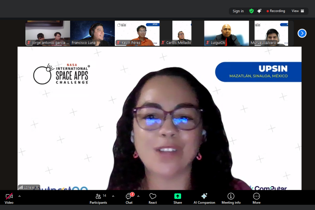 La MEC. Carla Lorelei Rubio Vasavilbazo, host de la sede UPSIN, compartió con los participantes los detalles sobre el proceso de evaluación internacional, señalando que la NASA realiza una revisión adicional de los proyectos cargados en la plataforma oficial, lo que podría otorgar pases complementarios a la siguiente fase global del hackatón.